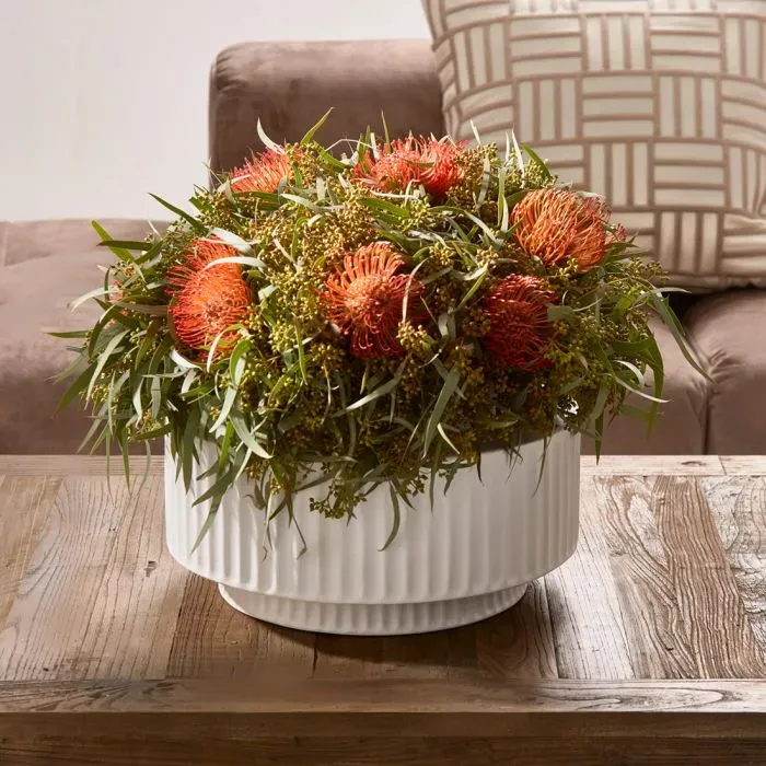 RM Aelous Planter, vernoemd naar de God van de wind in de Griekse mythologie. Al hebben planten liever geen of weinig wind. Deze plantenbak van wit geribbeld porselein geeft de plant die je erin zet, een extra vleugje elegantie.